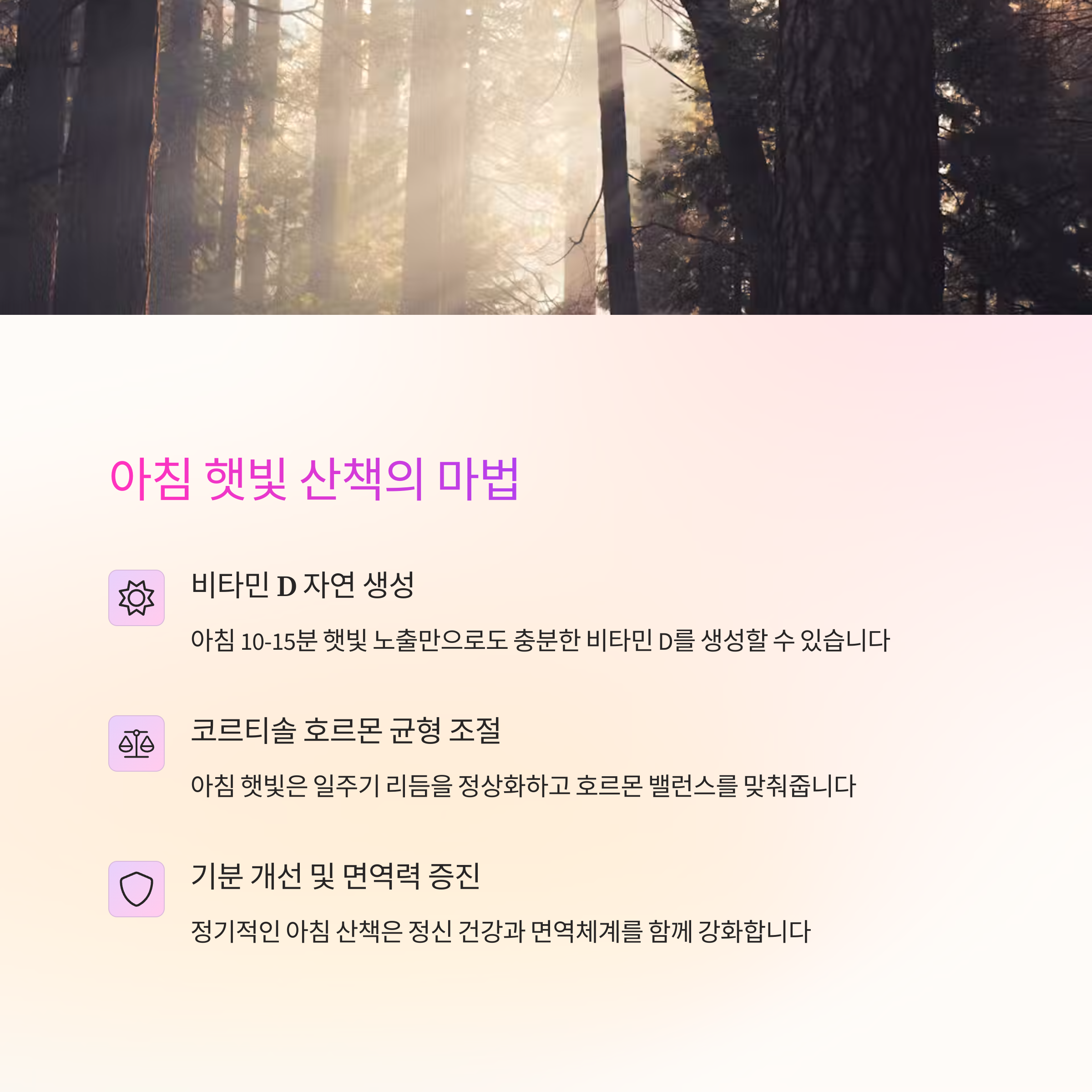 저 같은 경우 아침에 햇빛 쬐면서 10분 산책하는 것만으로도 체력 회복이 확 느껴졌어요.