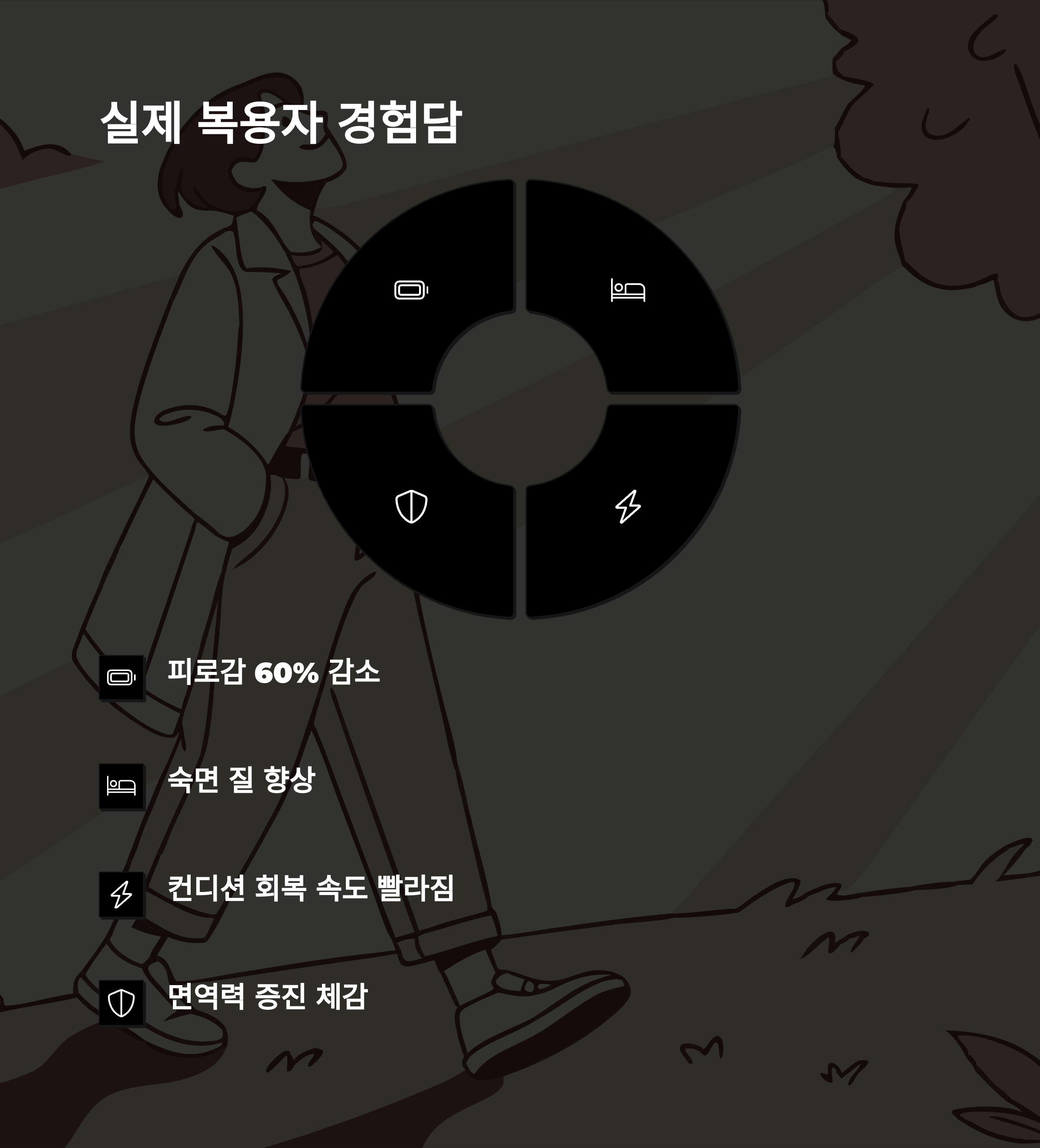 - 40대 주부 이OO: "아이 키우면서 느꼈던 만성 피로가 눈에 띄게 줄었어요."