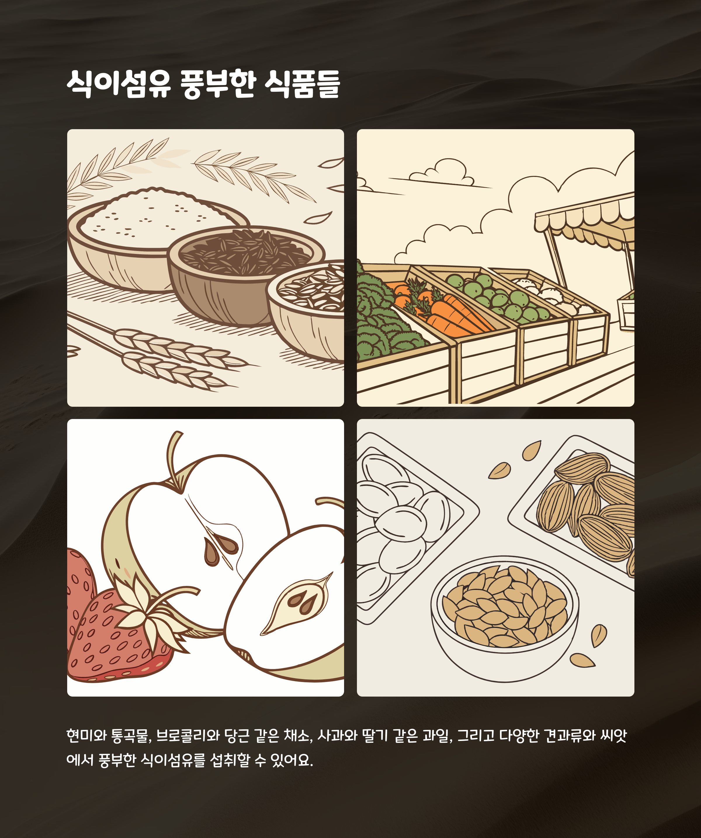 | 불용성 식이섬유 | 소화되지 않고 장 운동 촉진 | 통밀, 브로콜리, 당근, 양배추 |