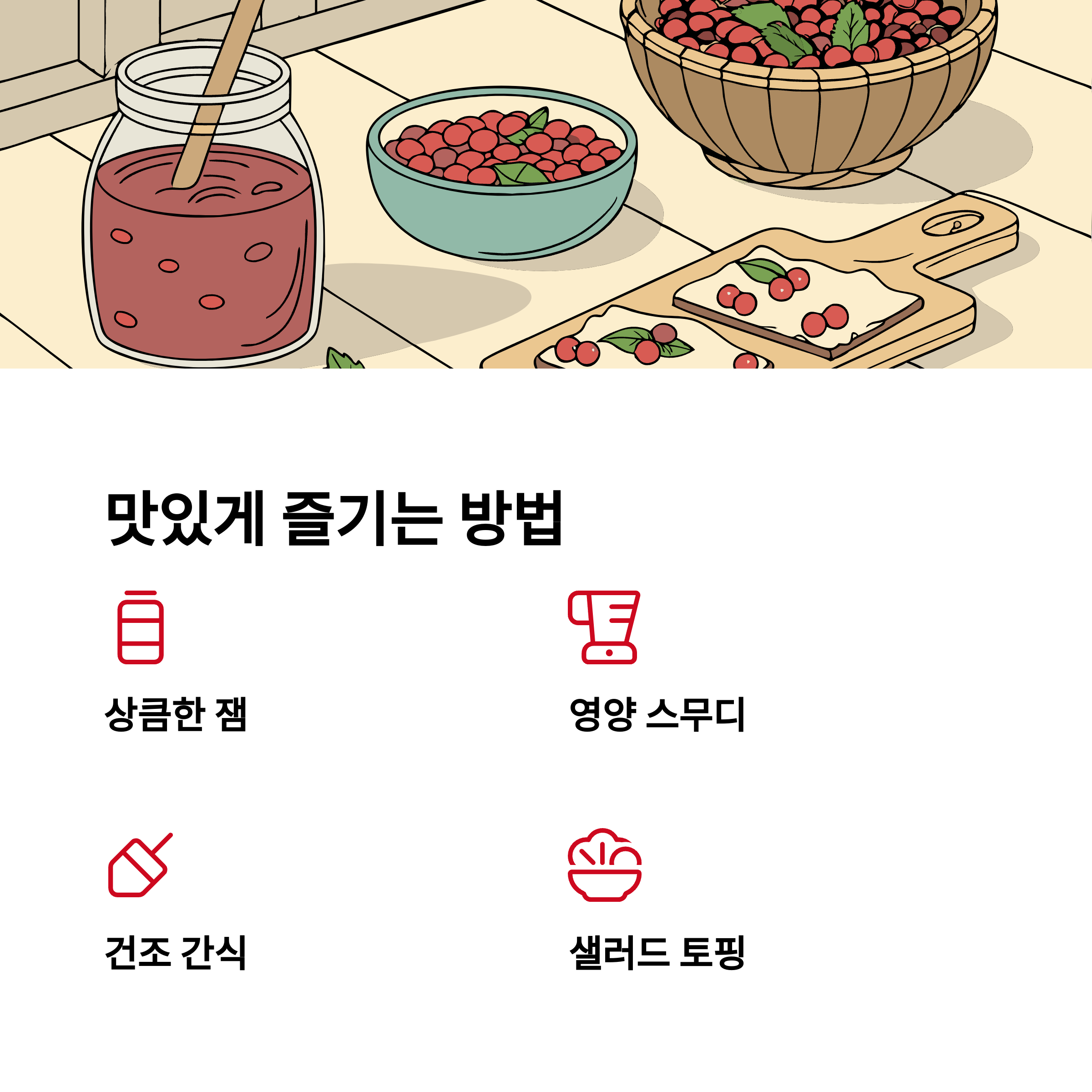 | 드라이 링곤베리 | 간식이나 시리얼에 넣어 먹기 좋아요. |
