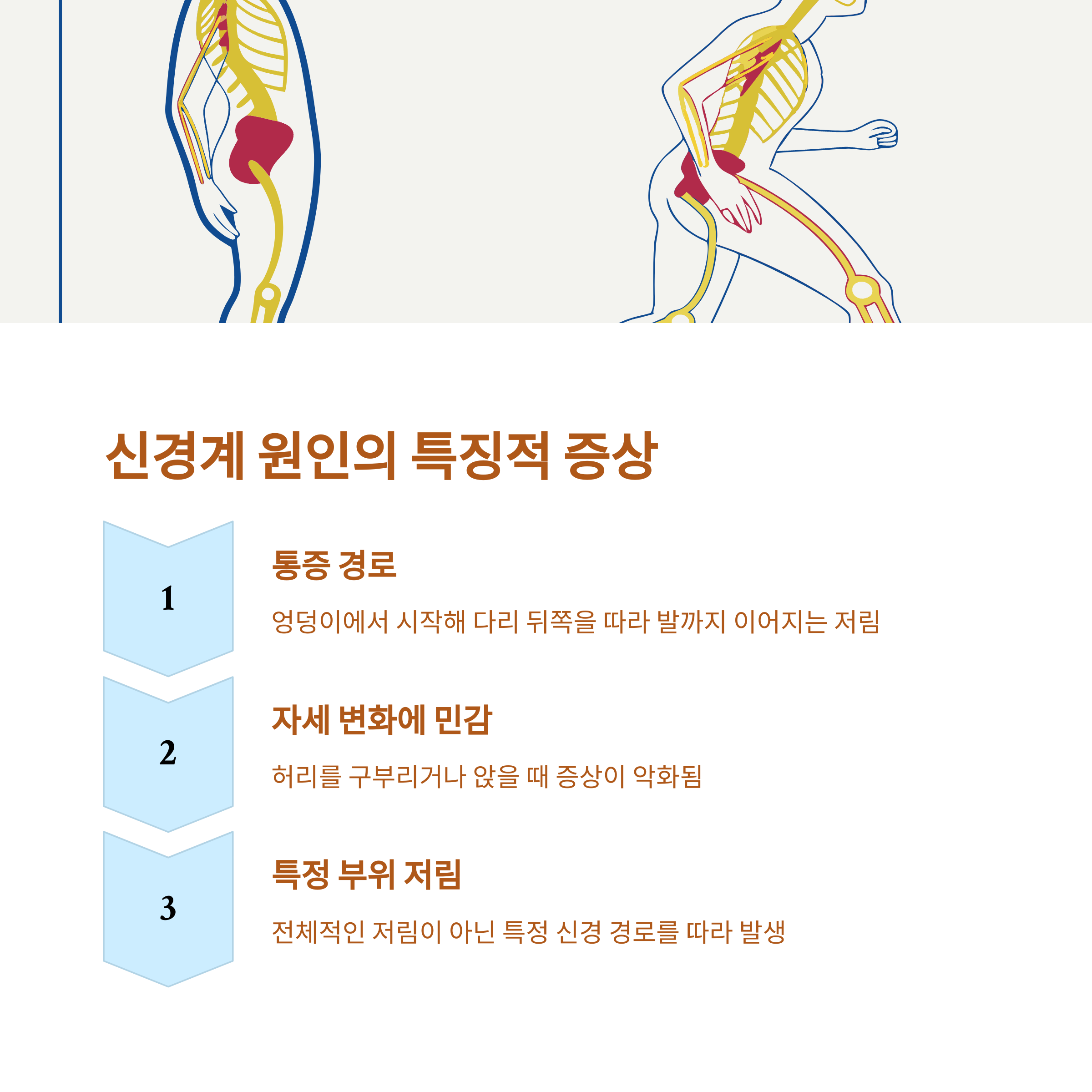 | 통증 위치 | 발끝, 손끝 | 엉덩이~종아리 |