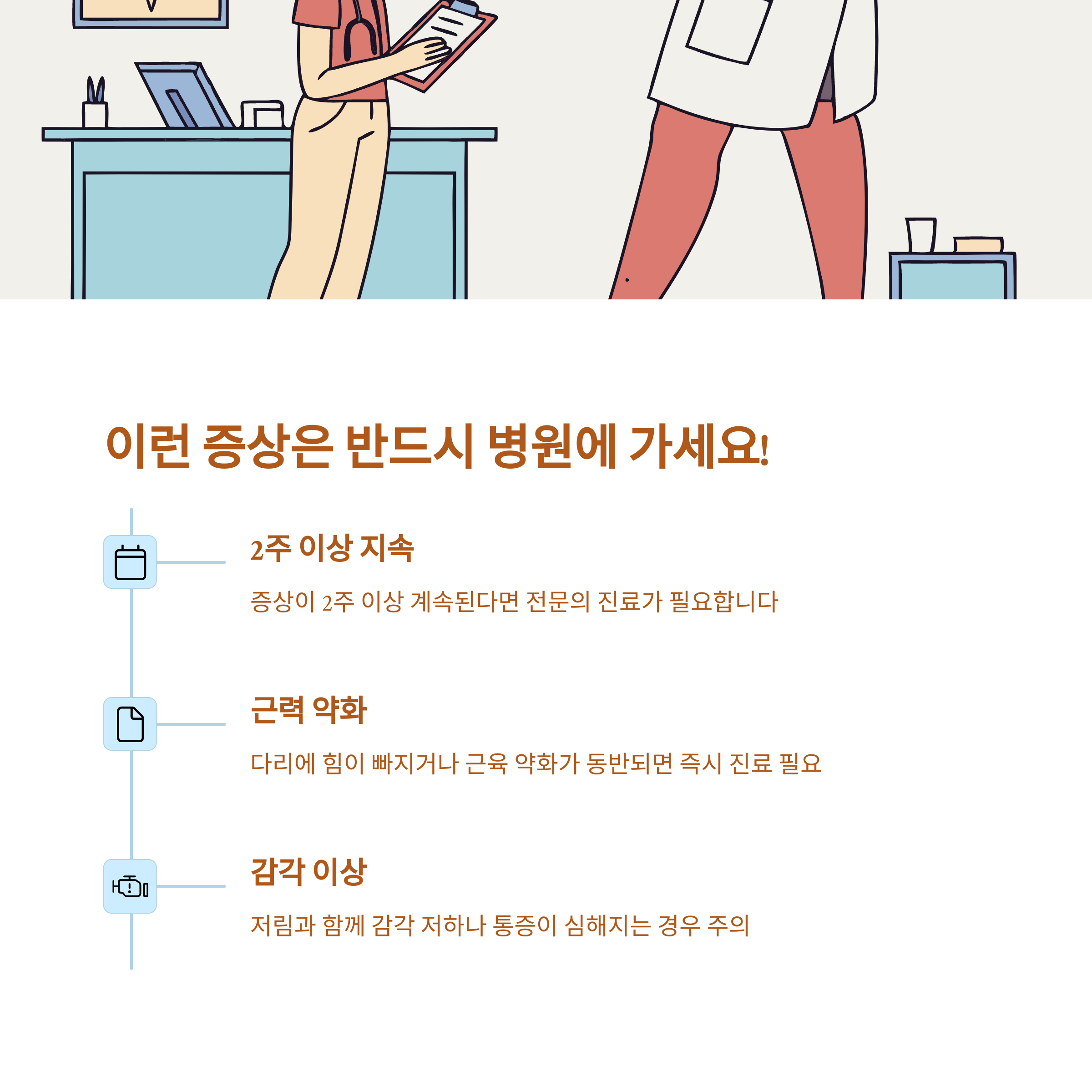 다리 저림이 일시적인 증상이라면 휴식으로도 좋아질 수 있어요. 하지만 다음과 같은 경우라면 반드시 전문의의 진단을 받아야 합니다.