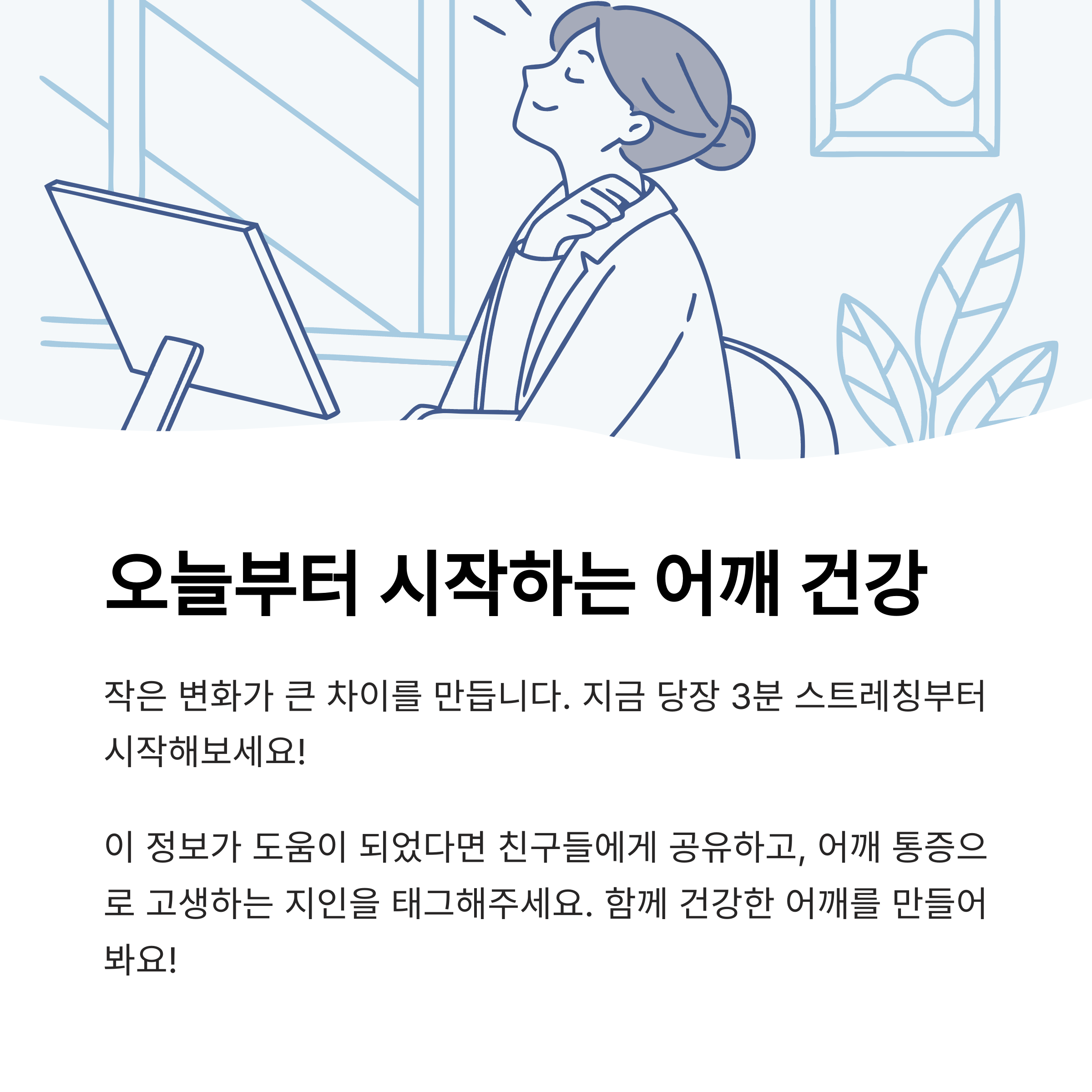 하루 중 가장 힘든 시간이 언제인가요? 저는 퇴근 후 씻고 침대에 눕기 전, 어깨가 뻐근해서 자꾸 자세를 뒤척이게 되는 그 순간이 가장 피곤하더라고요. 근데 정말 신기하게도, 매일 3분씩 스트레칭을 하니까 훨씬 가볍고 부드러운 느낌이에요. 여러분도 오늘부터 딱 3분! 어깨 결림을 풀어주는 이 작은 습관을 실천해보세요. 생각보다 큰 차이를 느끼실 수 있을 거예요. 다음에도 몸이 가벼워지는 꿀팁으로 다시 만나요 😊