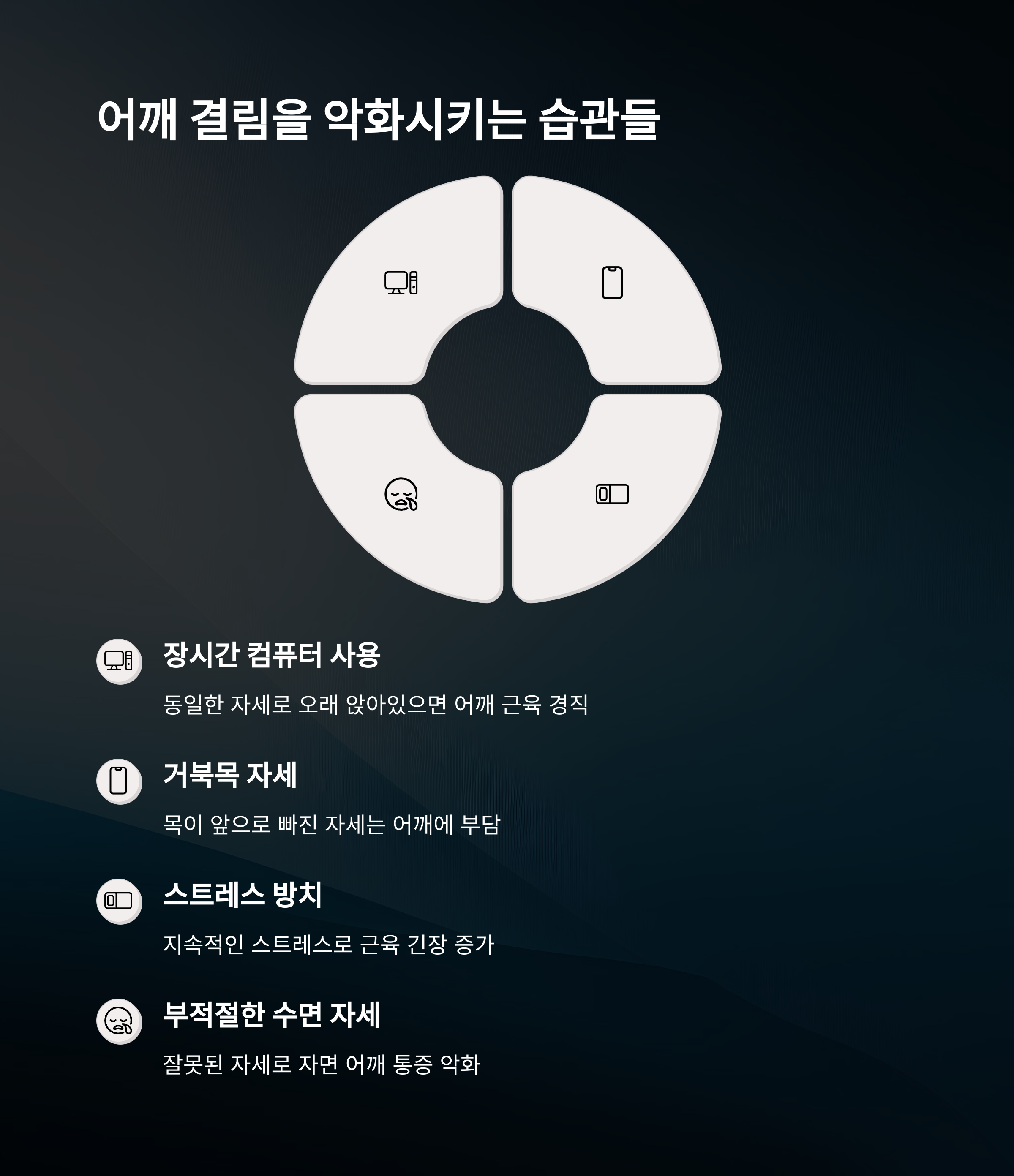 | 자세 불균형 | 구부정한 자세, 목을 앞으로 뺀 자세 등이 근육 피로 유발 |