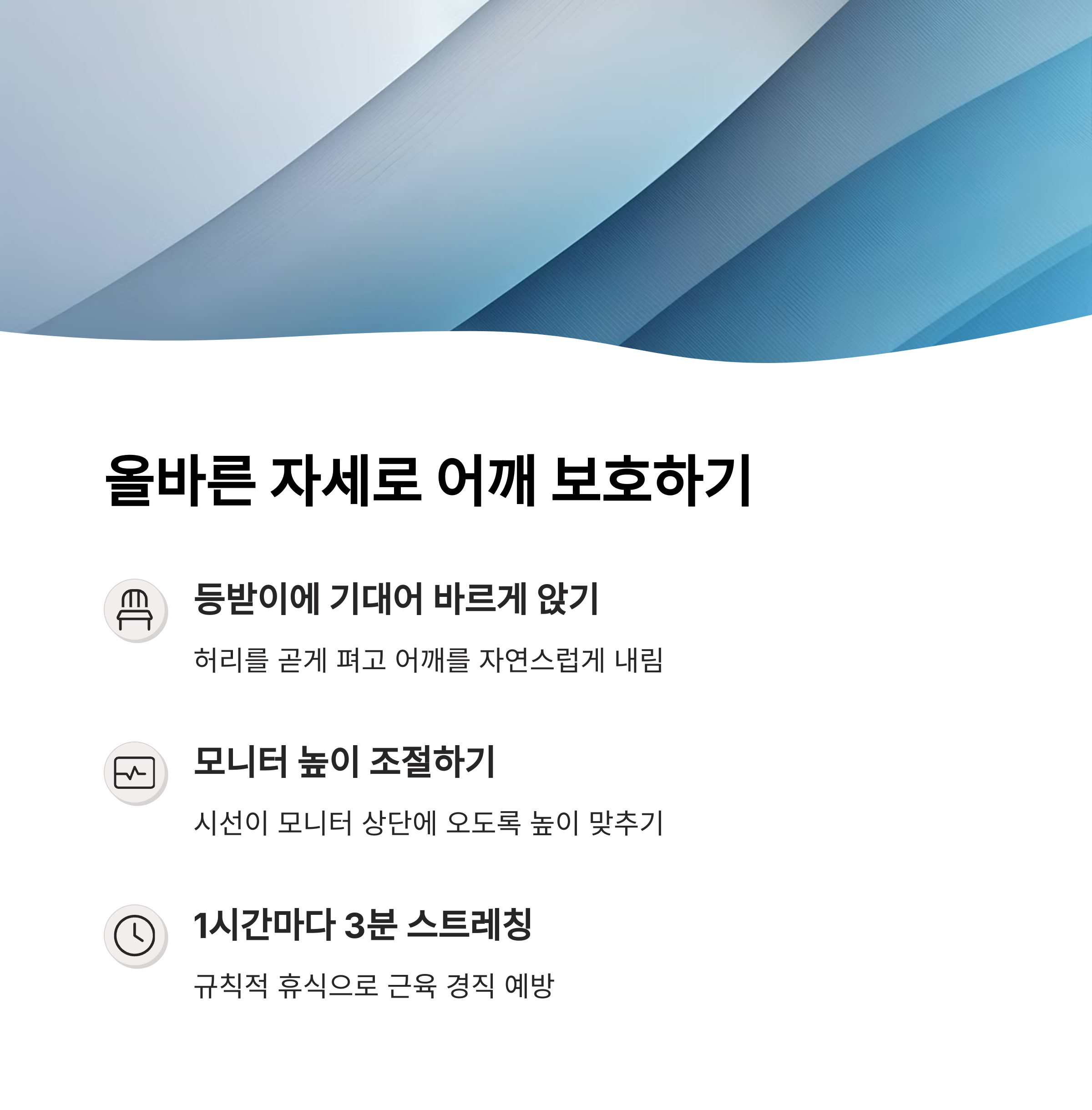 자, 이제 진짜 중요한 시간이에요. 아래 3가지 동작만 매일 1분씩 따라 해보세요. 정말 신기하게도 어깨 결림이 슬슬 풀리는 걸 느낄 수 있어요.