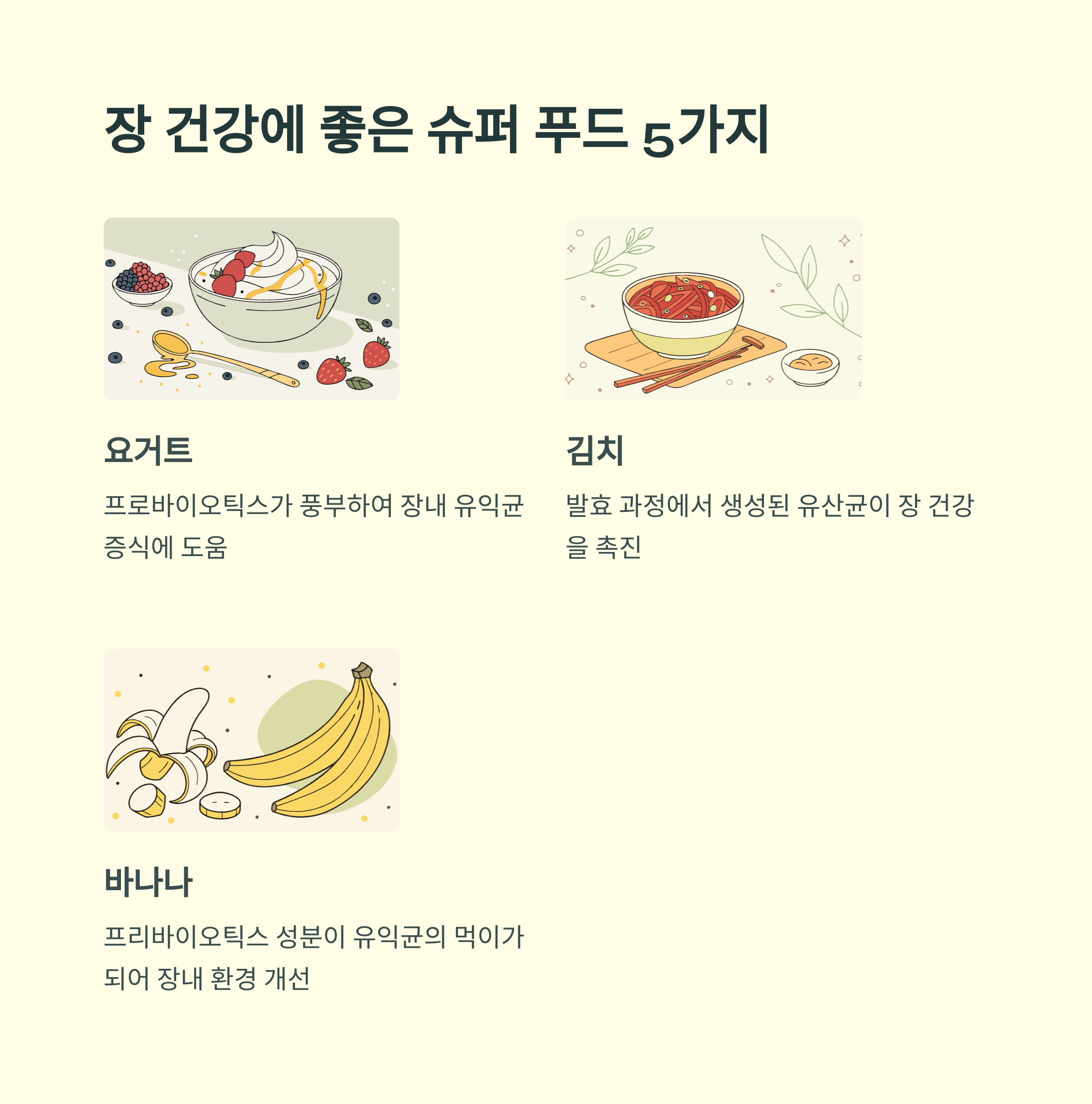 | 발효식품 | 김치, 요구르트, 된장 | 유익균 공급, 장내 균형 유지 |