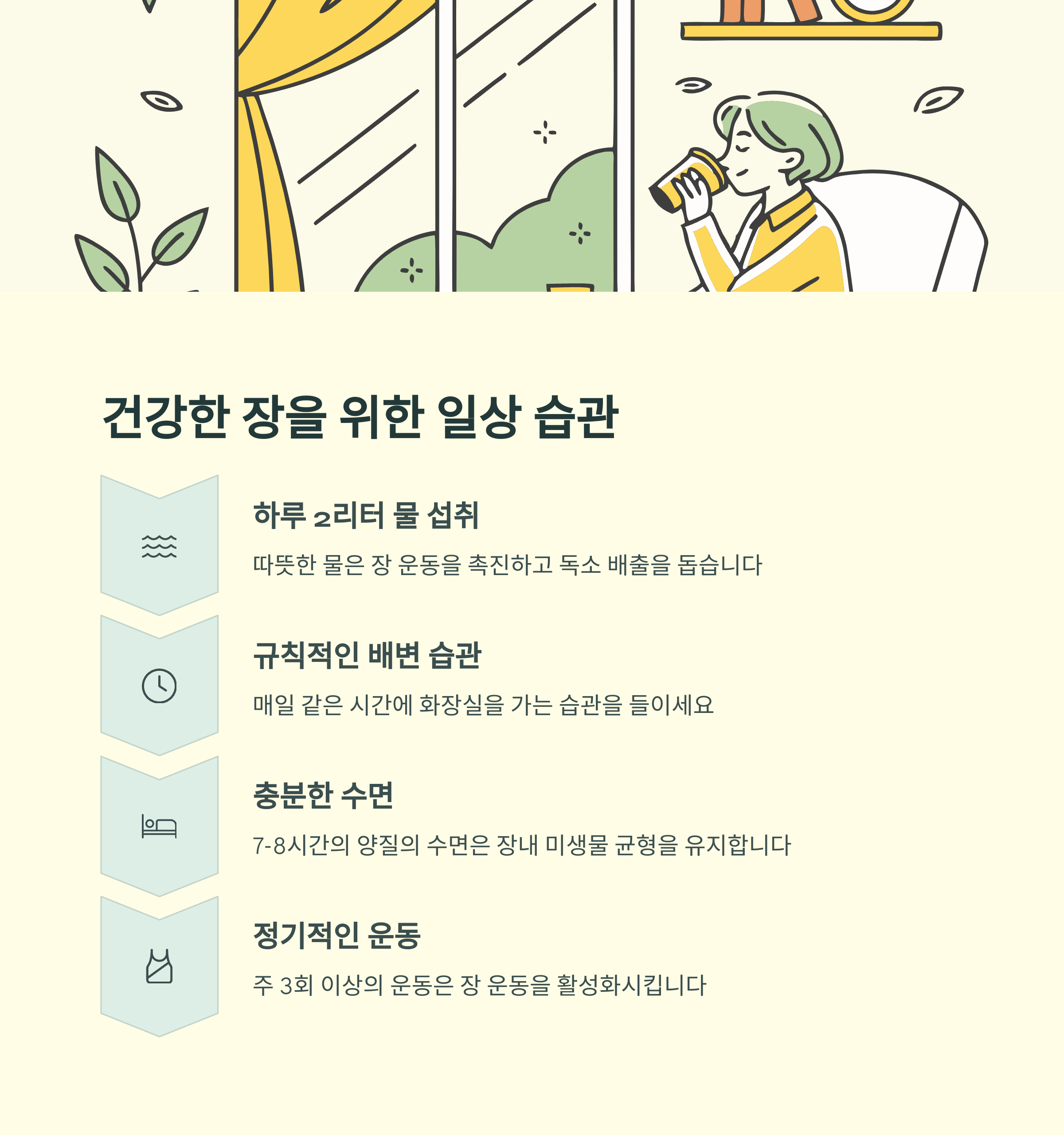장 건강 관리법은 결국 꾸준한 실천이 핵심이에요.